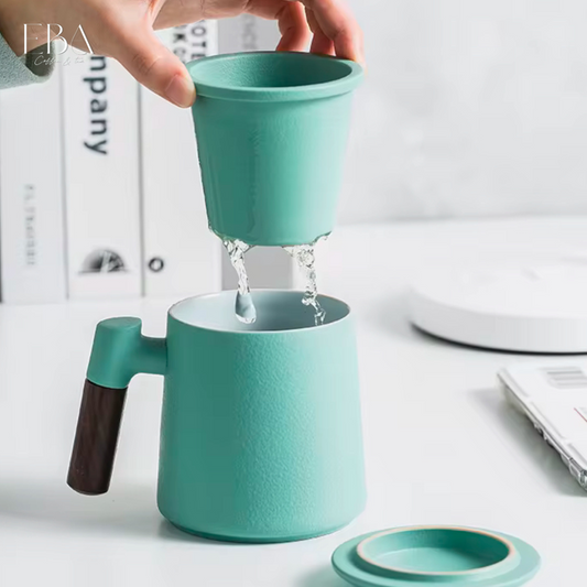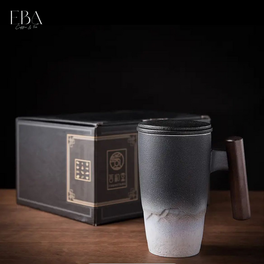 كوب شاي سيراميك فخم بسعة 500 مل مع مصفاة وغطاء ومقبض خشبي
